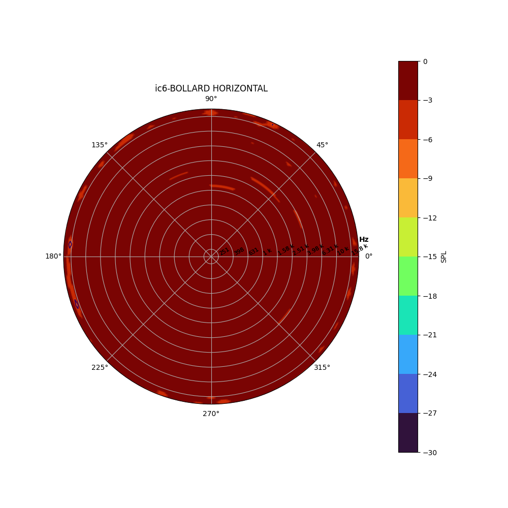 The “Directivity Contour Plot” shows the speaker’s dispersion characteristics using color to represent output magnitude. A quick inspection of the ic6-BOLLARD’s Directivity Contour Plot almost looks like a mistake.